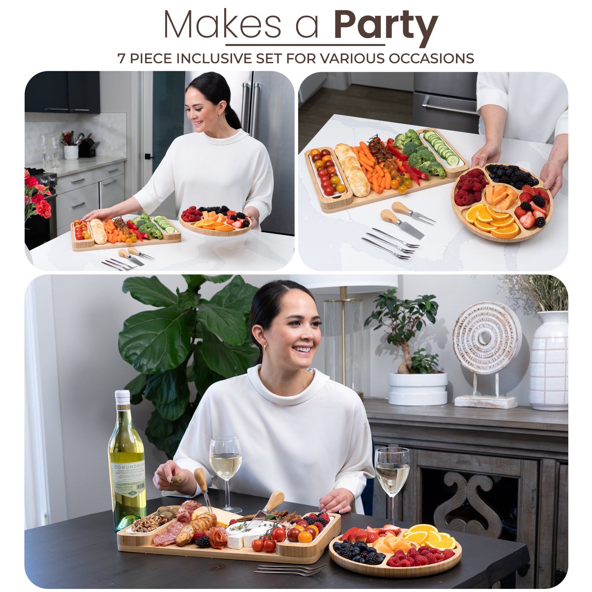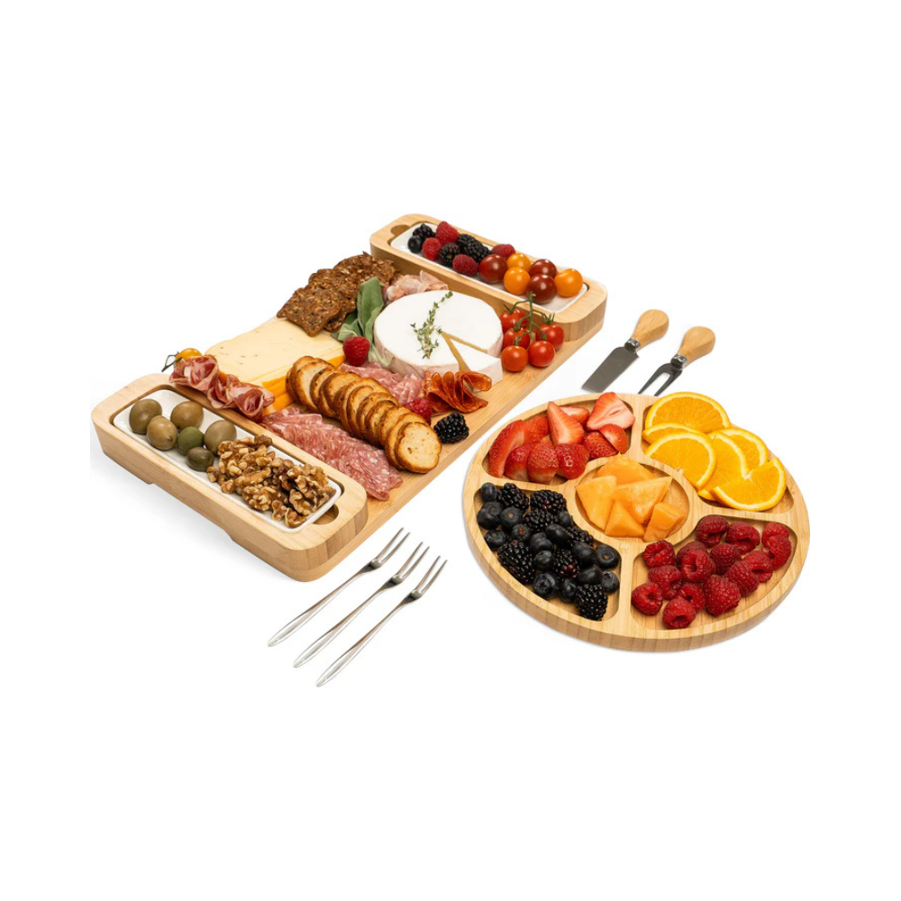 All-in-one charcuterie set with large board, round tray, ceramic bowls, cheese knives, and serving forks